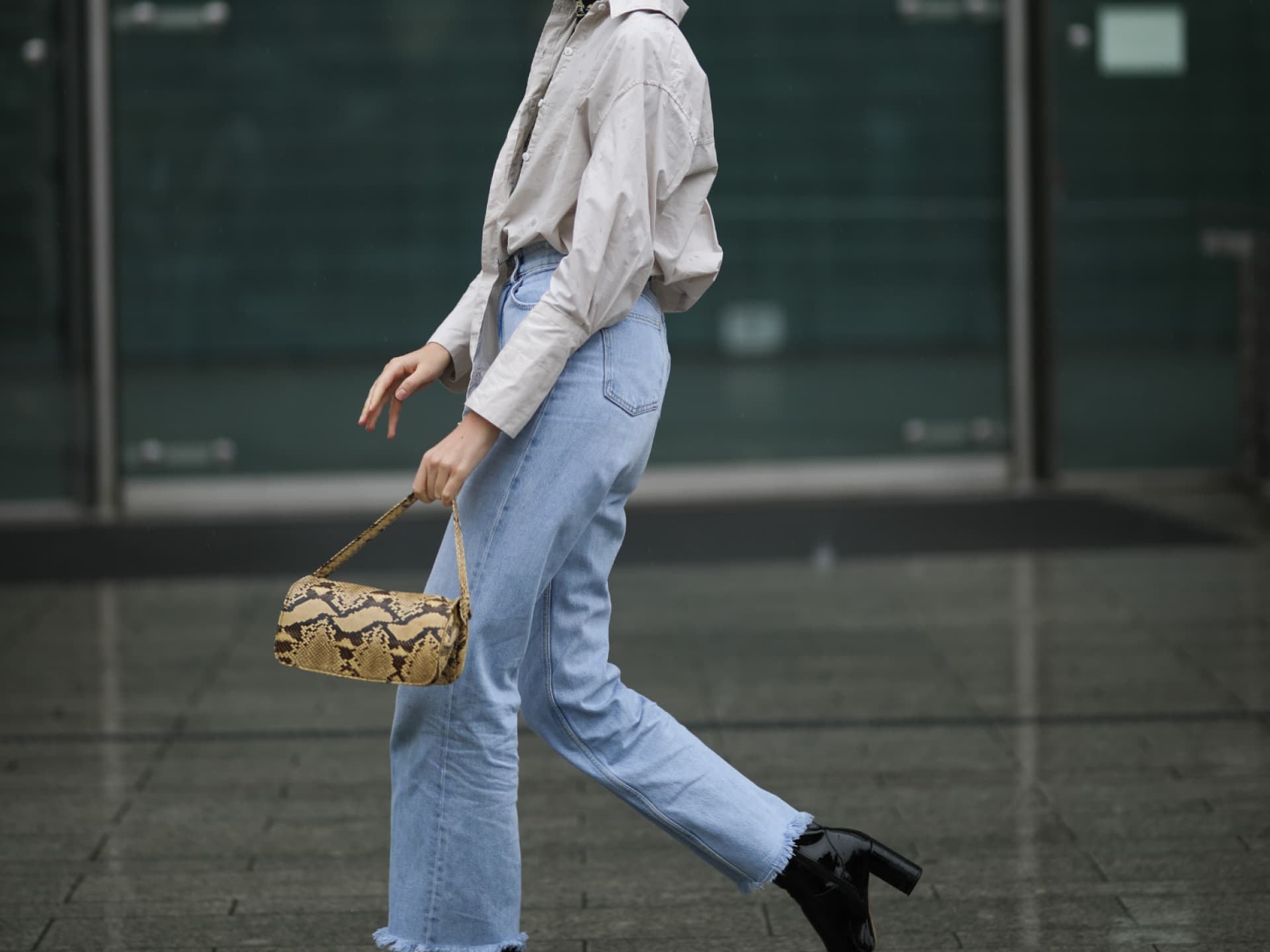 Wer nur kurz über die perfekte Kombination zum Boot nachdenkt, wird wahrscheinlich zunächst an Skinny Jeans denken. Mit ihnen umgehen wir lästiges Stopfen und Berge von Stoff, die sich oberhalb des Schafts auftürmen. Doch halt: Diese Variante ist zwar praktisch und simpel, kann jedoch auch ziemlich langweilig sein und kleine Problemzonen unvorteilhaft betonen. Aus diesem Grund ist die Skinny Jeans zwar ein Allrounder, aber eben nicht das perfekte Match für unseren liebsten Herbst-Schuh. Doch einen Blick auf unsere liebsten Steetstyle-Stars geworfen, haben wir den perfekten Begleiter doch ganz schnell für dich ausfindig machen können. Siehe da – nicht etwa hautenge, sondern weiter geschnittene Flare Leg Jeans sind das Nonplusultra zu Stiefeletten. Die etwas kürzer geschnittene Hose hat schon seit Längerem ihr biederes "Hochwasser"-Image abgelegt und ist jetzt nämlich ein echtes Lieblingsteil der Streetstyle-Profis! Dank ihres Schnitts berührt sie die Stiefel – auch solche mit höherem Schaft – nicht, und verlängert dennoch optisch die Silhouette, indem sie deine Fessel subtil in Szene setzt. Das Modell umschließt unser Bein an genau den richtigen Stellen und zeigt dort Weite, wo es gut ankommt – auf Mitte der Wade, also zu Beginn der Boots.