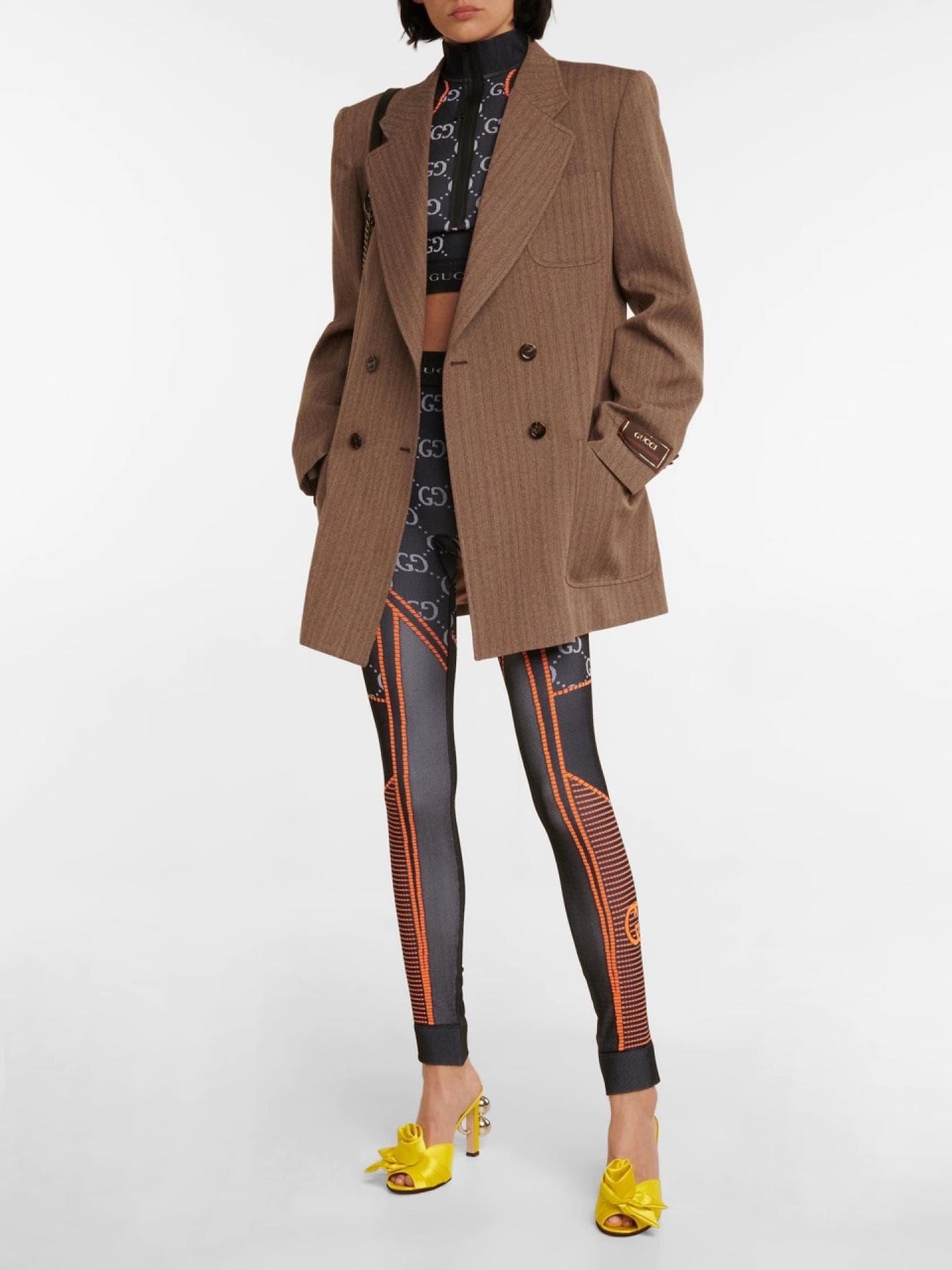 Besonders die Leggings von Gucci lässt unsere Fashion Herzen höher schlagen. Da werden alle Träume von Fashionistas wahr! Das klassische Muster der Brand ist in Grau gehalten und trifft auf eine orangene Verzierung. Die Grundfarbe des Modells ist Blau und auch der hochgeschnittene Bund macht ordentlich etwas her: Dort steht in Versalien Gucci geschrieben. Das wundervolle Designerteil wurde in Italien gefertigt und kommt in einem Material aus Jacquard-Strick daher. Selbst Influencerinnen wie Tina Leung sind Fan der Traum-Leggings.