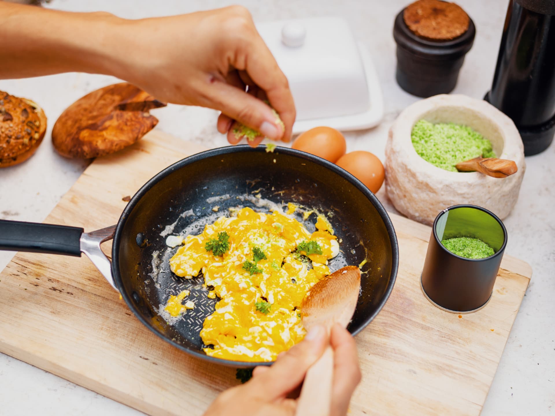 Eier schmecken nicht nur superlecker, sie liefern außerdem eine Menge Proteine und enthalten wenig Kohlenhydrate. Eiweiß ist zudem reich an Vitamin D sowie B12, welche die Fettverbrennung unterstützen und das Lebensmittel zum wahren Flacher-Bauch-Frühstück qualifizieren. Die gewichtsreduzierende Wirkung des Frühstückseis hat auch die Studie der Saint Louis University bewiesen: Ein erhöhter Eier-Konsum führt nämlich zu einem 65 Prozent höheren Gewichtsverlust als kohlenhydratreiche Mahlzeiten – wir sind begeistert! Die schnellsten und effektivsten (und auch leckersten) Erfolge während der Eier Diät erzielt ihr, wenn ihr zwei bis drei mittelgroße Eier miteinander verquirlt und die Masse anschließend ordentlich durchbratet, was mit der Jamie Oliver Cook´s Direct On Bratpfanne von Tefal (über Amazon für ca. 60 statt 100 Euro) zum Kinderspiel wird.Dabei darf außerdem ein Schuss Sprudelwasser nicht fehlen und auch unsere Lieblingsgewürze, allen voran das "Rührei Gewürz" von Just Spices (knapp 6 Euro bei Amazon) kommt zum Einsatz. Je nach Bedarf kann das Ganze mit Tomaten, Pilzen, Paprika oder etwas fettarmen Hirtenkäse komplettiert werden – et voilà, nun könnt ihr entspannt dabei zusehen, wie die Pfunde von Tag zu Tag purzeln.💪🏽